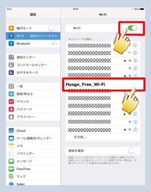 スマホの「設定」→「Wi-Fi」をタップし、ネットワーク一覧からSSIDの「Hyogo Free Wi-Fi」を選択する
