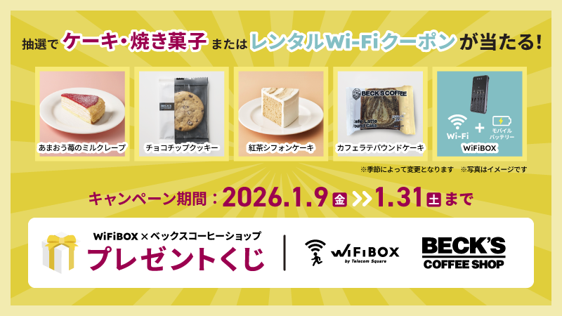 モバイル通信のクロスボーダー・ソリューションを世界規模で提供する株式会社テレコムスクエア(本社:東京都千代田区、代表取締役:吉竹 雄次、以下、当社)は、株式会社JR東日本クロスステーションフーズカンパニー(本社:東京都渋谷区、カンパニー長:中俣 博文)の運営する「ベックスコーヒーショップ」のうちWiFiBOXを設置する33店舗限定で、「WiFiBOX×ベックスくじ」キャンペーンを2026年1月9日(金)より実施いたします。