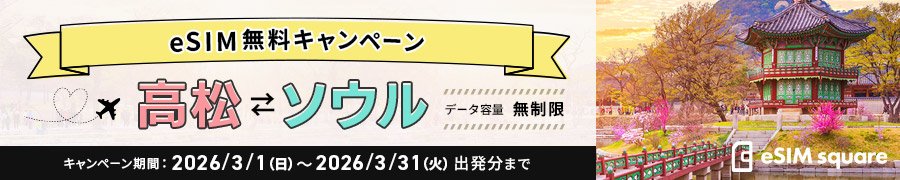 モバイル通信のクロスボーダー・ソリューションを世界規模で提供する株式会社テレコムスクエア(本社:東京都千代田区、代表取締役:吉竹 雄次、以下、「当社」)は、高松空港振興期成会(会長:香川県知事 池田豊人)および高松空港株式会社(代表取締役社長 小幡義樹)と共同で、2026年3月1日(日)~2026年3月31日(火)に高松空港を出発するソウル便往復利用者に向けてeSIMを無料配布するキャンペーンを実施いたします。